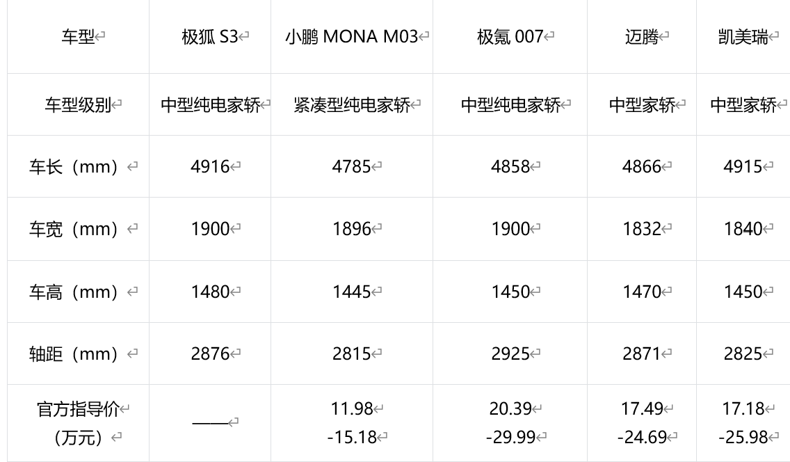 要知道,这个尺寸不仅比市面上多数热销的10万级纯电家轿大一圈,甚至超越了凯美瑞、迈腾等经典燃油B级车。这意味着,以前要花二十万才能拥有的中型车空间,现在极狐S3用10万级就给你了。即便把它和不少热门中大型轿车放在一起,尺寸也基本相当。