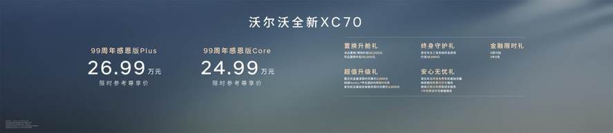 4月15日,在沃尔沃汽车99周年庆典暨新品发布会上,沃尔沃全新XC70 99周年感恩版Core与99周年感恩版Plus正式上市,限时参考尊享价分别为26.99万元和24.99万元,并同步推出多项超值限时购车权益。作为品牌99周年力作,全新XC70 99周年感恩版以越级配置、诚意价格和权益,将全方位安全守护、全场景从容出行与北欧奢享体验带入25万级市场,重新定义了豪华插混SUV的价值标准。