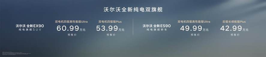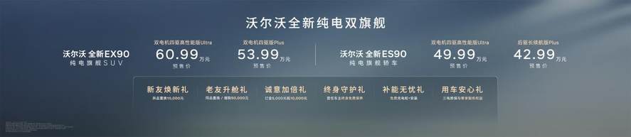 2026年4月15日,在沃尔沃汽车99周年庆典暨新品发布会上,沃尔沃汽车正式宣布旗下全新纯电旗舰SUV EX90及全新纯电旗舰轿车ES90开启预售,预售价分别为53.99万元起、42.99万元起,并同步推出六重豪礼预订权益,以十足诚意回馈用户信赖。全新纯电旗舰SUV EX90为豪华纯电SUV树立了标杆,灵活的七座布局使其成为全场景家庭出行的品质之选;而全新纯电旗舰轿车ES90则完美诠释北欧的平衡哲学,以出众的功能性,让生活回归收放自如的从容。