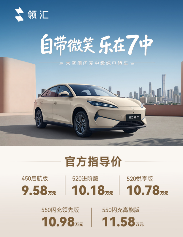 领汇汽车带着搭载比亚迪第二代刀片电池+闪充技术的大空间闪充中级纯电轿车——领汇e7来了!推出5款配置,官方指导价9.58-11.58万元,直接把"闪充"拉进了10万级阵营。