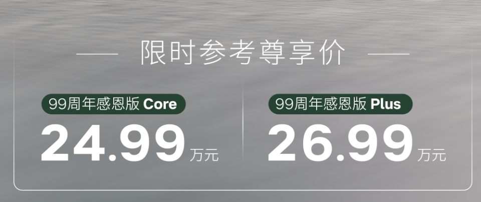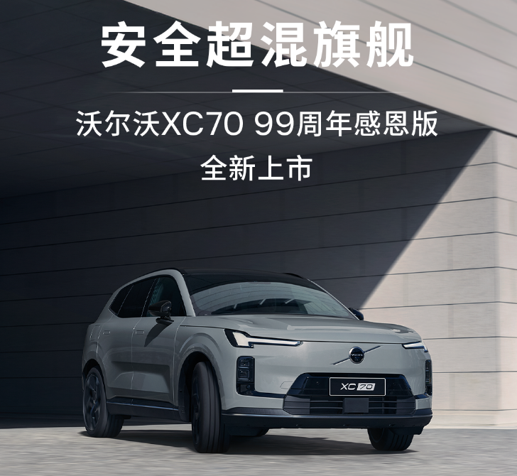 全新XC70 99周年感恩版基于SMA超混架构打造,以越级安全、超长续航、智能配置与诚意价格,成为25万级豪华插混SUV最优解,致敬99周年,回馈用户信赖。全新XC70 99周年感恩版Core上市价格24.99万元,全新 XC70 99 周年感恩版 Plus 上市价格26.99万元。车辆配备硼钢笼式车身加三路三区吸能结构,六宫格全铝门槛梁加田字型全铝电池框架,碰撞断电小于50毫秒,满足极端热扩散不起火不爆炸标准。23个智能感知硬件,21项主动安全功能,DMS驾驶员监测3秒精准预警,CLEANZONE清洁座舱、无铬鞣 Nappa 真皮与环保织物,打造超低VOC健康空间。搭载1.5T混动专用发动机加 3DHT 变速箱加P1加P2电驱,系统综合功率234kW,零百加速 8s,CLTC纯电续航116km,综合续航超1200km,亏电油耗低至5.85L每100km,支持 6kW 对外放电,兼顾日常通勤与户外出行。配备15.4 英寸中控屏加12.3英寸仪表,支持远程控温、遥控泊车、AI大模型语音与四音区识别,四种休憩模式、Harman Kardon23扬声器音响、北欧专属香氛,打造移动治愈空间,0-150km/h全速域领航辅助,行车娱乐约束规则,安全与智能兼顾。