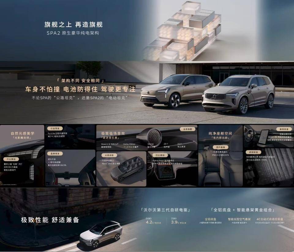 两款纯电旗舰采用纯电笼式车身,A/B/C柱搭载1500MPa超强硼钢,顶压可承受超4倍车重,创新三路三区碰撞吸能结构、一体式集成横梁与可溃缩中央纵梁,构筑乘员舱安全堡垒。电池配备硼钢防护系统加10mm 铝合金底板,3ms智能熔断双保险、六通道防爆阀与双层防火隔热,实现电芯0侵入严苛标准。行业首创 DUS 驾驶员感知系统,三级预警守护驾驶安全,CLEANZONE北欧清洁座舱搭载科德宝高效滤芯,PM2.5过滤95%、病毒去除率 97%,严控6000+禁限用物质,打造母婴级健康空间。搭载沃尔沃自研第三代电驱系统,EX90零百加速4.2s、CLTC续航756km,ES90最大功率500kW、零百加速3.9s、CLTC续航高达848km。双腔空气悬架加4C主动自适应底盘,每秒500 次阻尼调节,兼顾舒适与操控,Brembo 高性能卡钳,百公里制动距离低至35米,打造旗舰级驾控质感。标配宝华韦健7.1.4杜比全景声音响,25扬声器、1610W功率,搭载Abbey Road录音室模式与Dirac Unison调音技术,全座皇帝位听音体验。EX90标配调光天幕,紫外线隔绝率 99.5%,Sunlike太阳光谱照明,ES90拥有3.1米超长轴距、后排电动可调与座椅通风加热,FSC 认证实木透光饰板、无铬鞣 Nappa 真皮,演绎斯堪的纳维亚极简美学。14.5英寸中控屏加9英寸仪表加13.2英寸 HUD 三屏联动,Volvo Car UX界面简洁高效,全时免唤醒AI语音、四音区识别、可见即可说、情感化音色与留声复刻功能,实现人车自然交互,中央集中式架构支持OTA持续迭代,越用越新。