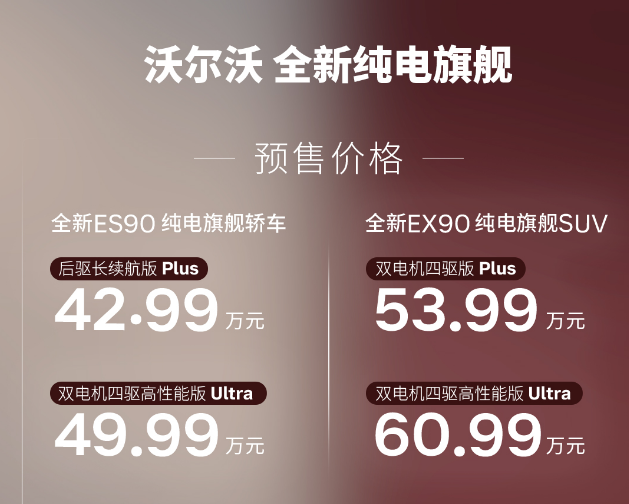 基于SPA2原生豪华纯电架构打造,EX90与ES90拒绝油改电妥协,以800V高压平台、中央集中式电子电气架构、全铝底盘与双腔空气悬架,实现安全、驾控、豪华、智能全域越级,传承沃尔沃百年安全基因,开创纯电旗舰新标准。沃尔沃EX90双电机四驱版 Plus 预售价格53.99万元,双电机四驱高性能版 Ultra 预售价格60.99万元。沃尔沃ES90后驱长续航版 Plus 预售价格42.99万元,双电机四驱高性能版 Ultra 预售价格49.99万元。