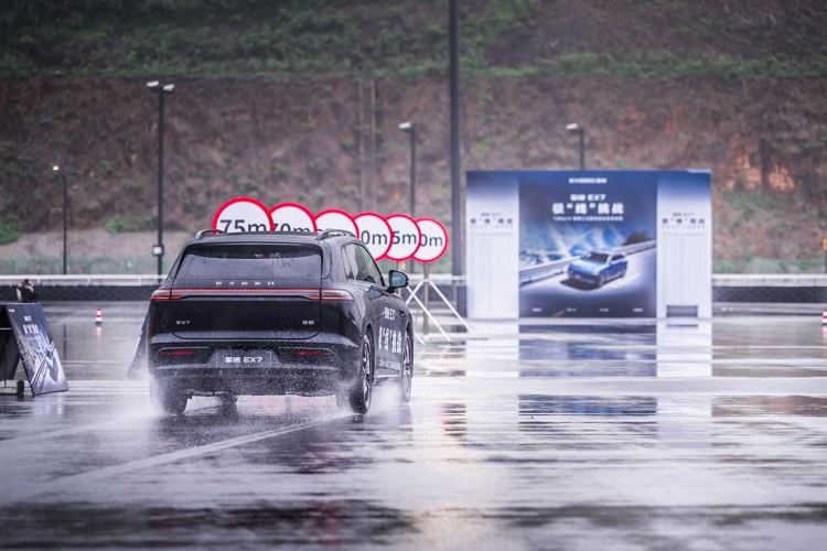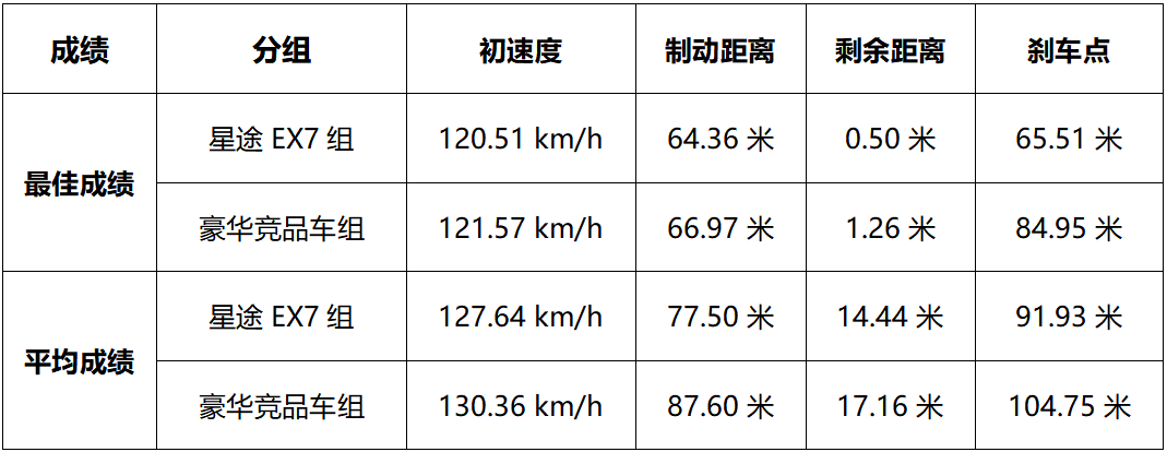 “刹场点兵”项目模拟120km/h高速行驶突发事故场需要最短距离制动的场景,地面积水给测试显著增加了难度,导致出现了41家媒体排队“撞墙”的盛况,但星途EX7得益于超快刹车反应速度,制动距离依然显著优于豪华竞品车。