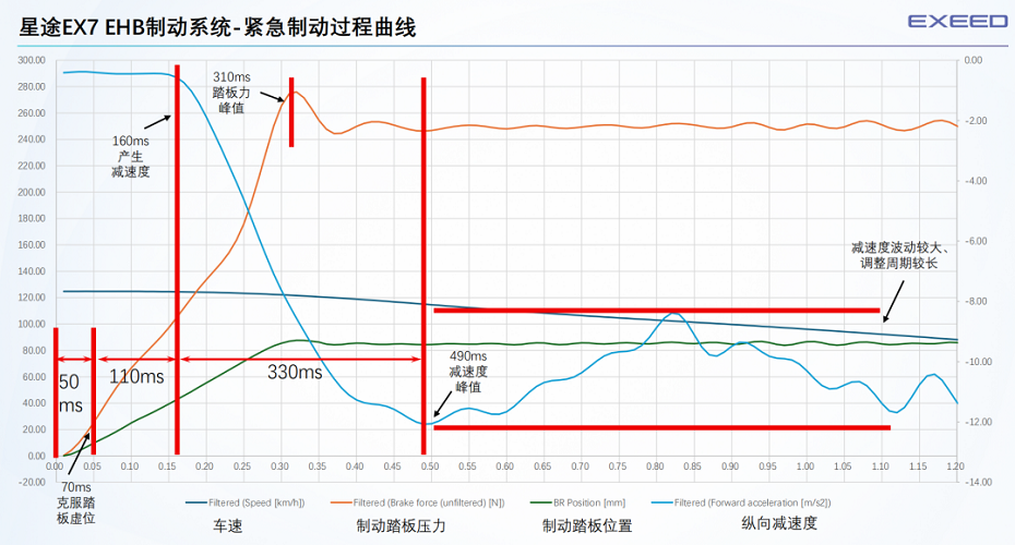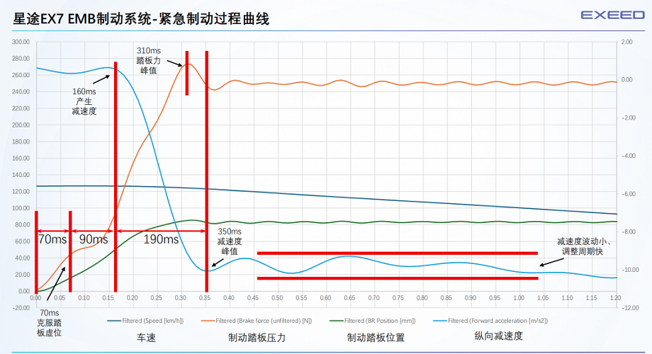 测试结果表明,即使在DEBUFF叠满的极端情况下,星途EX7只能依靠EMB供电冗余轻松保证制动能力。同时两轮爆胎后依然可以实现平稳刹停维持制动能力。