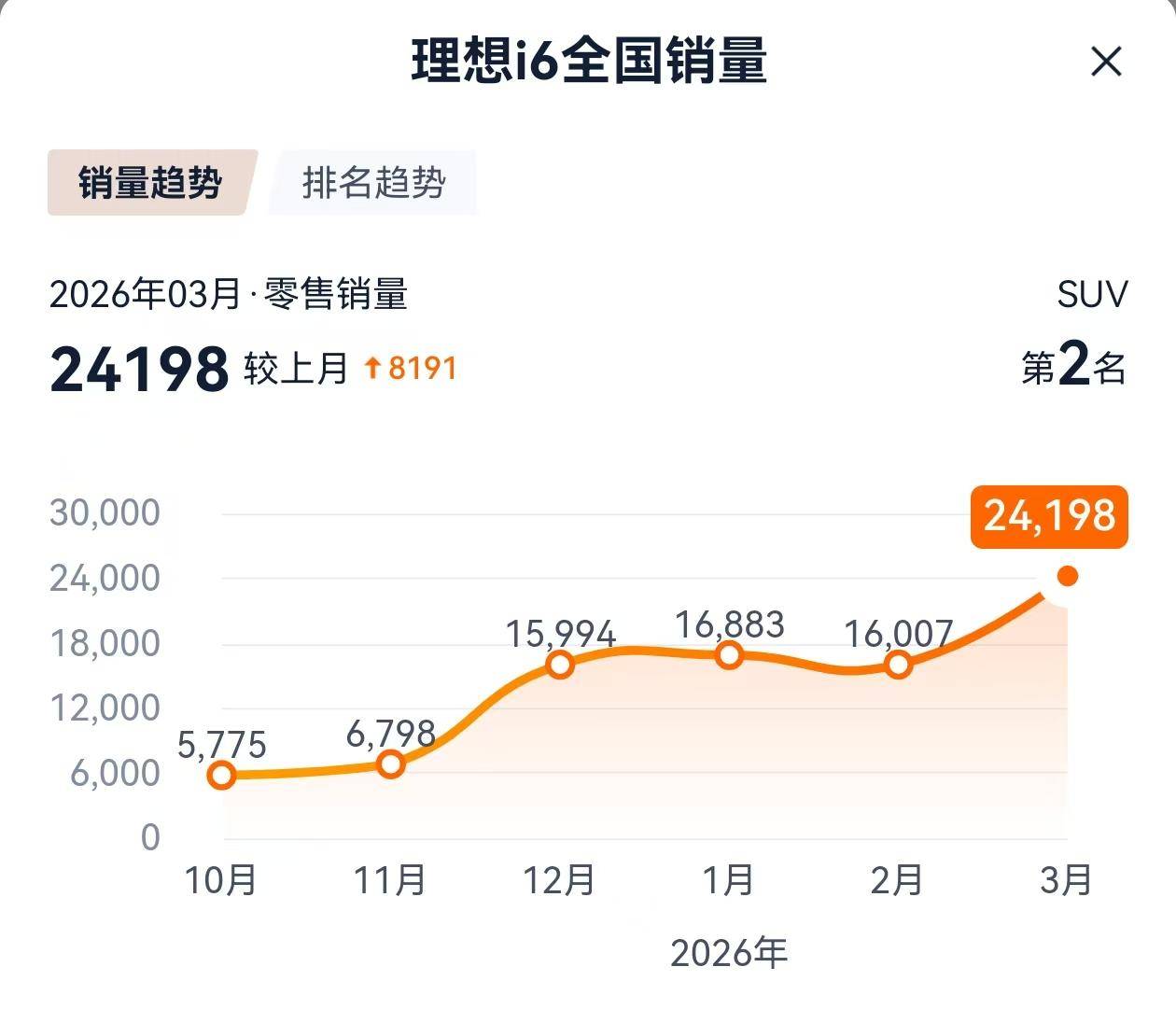 3月份对于国内车市而言,是一个复苏和变化的节点,从月度销量排行榜就可以看出端倪,其中尤其值得注意的是理想i6的爆发式增长,3月份销量为24198辆,名列全车市销量排名第四,SUV销量排名第二,成为当前理想汽车产品矩阵中当之无愧的销量支柱。理想i6为什么能够脱颖而出?它的一枝独秀对于理想汽车而言是喜是忧呢?
