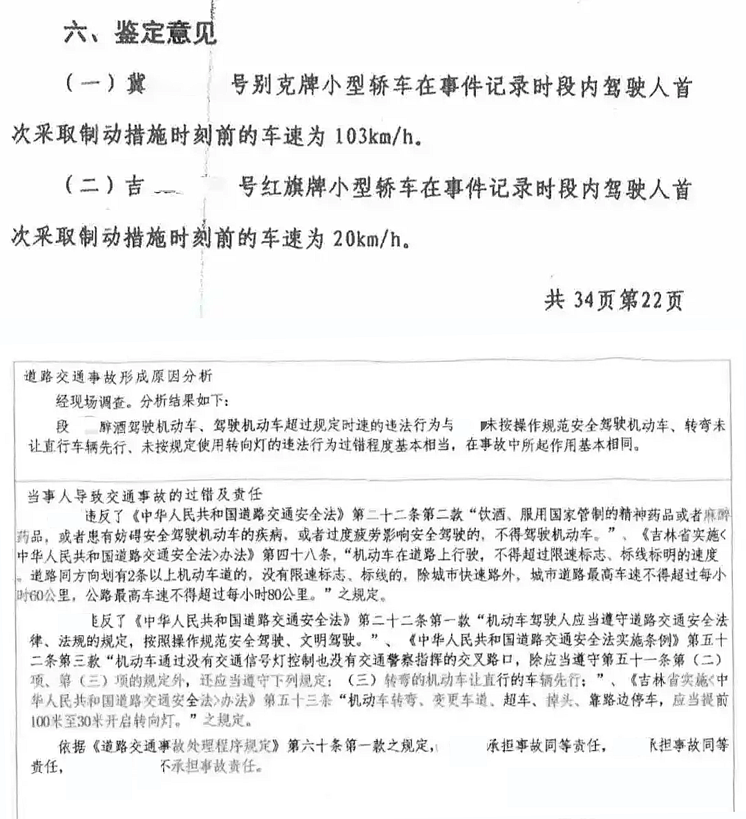经检测,段某血液酒精浓度为138.65mg/100ml,属于醉驾标准。同时段某在事故中首次采取制动(刹车)前的车速为103km/h,属于严重超速驾驶;而出租车司机并没有酒驾等问题,并且其首次采取制动措施前的车速仅为20km/h。可是该事故的《道路交通事故认定书》认定段某醉酒驾驶机动车、驾驶机动车超过规定时速的违法行为,与出租车司机未按照操作规范安全驾驶机动车、转弯未让直行车辆先行的违法行为过错程度基本相当,在事故中所起作用基本相同,承担同等责任,电动车驾驶员杨某无责任。
