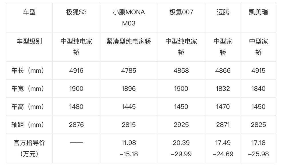 要知道,这个尺寸不仅比市面上多数热销的10万级纯电家轿大一圈,甚至超越了凯美瑞、迈腾等经典燃油B级车。这意味着,以前要花二十万才能拥有的中型车空间,现在极狐S3用10万级就给你了。即便把它和不少热门中大型轿车放在一起,尺寸也基本相当。