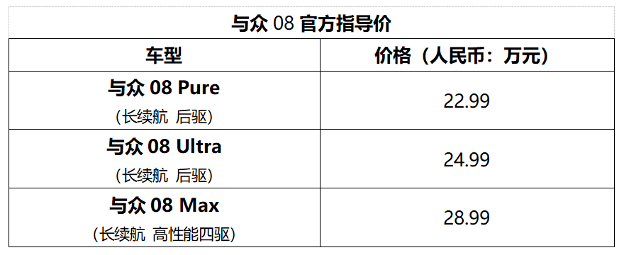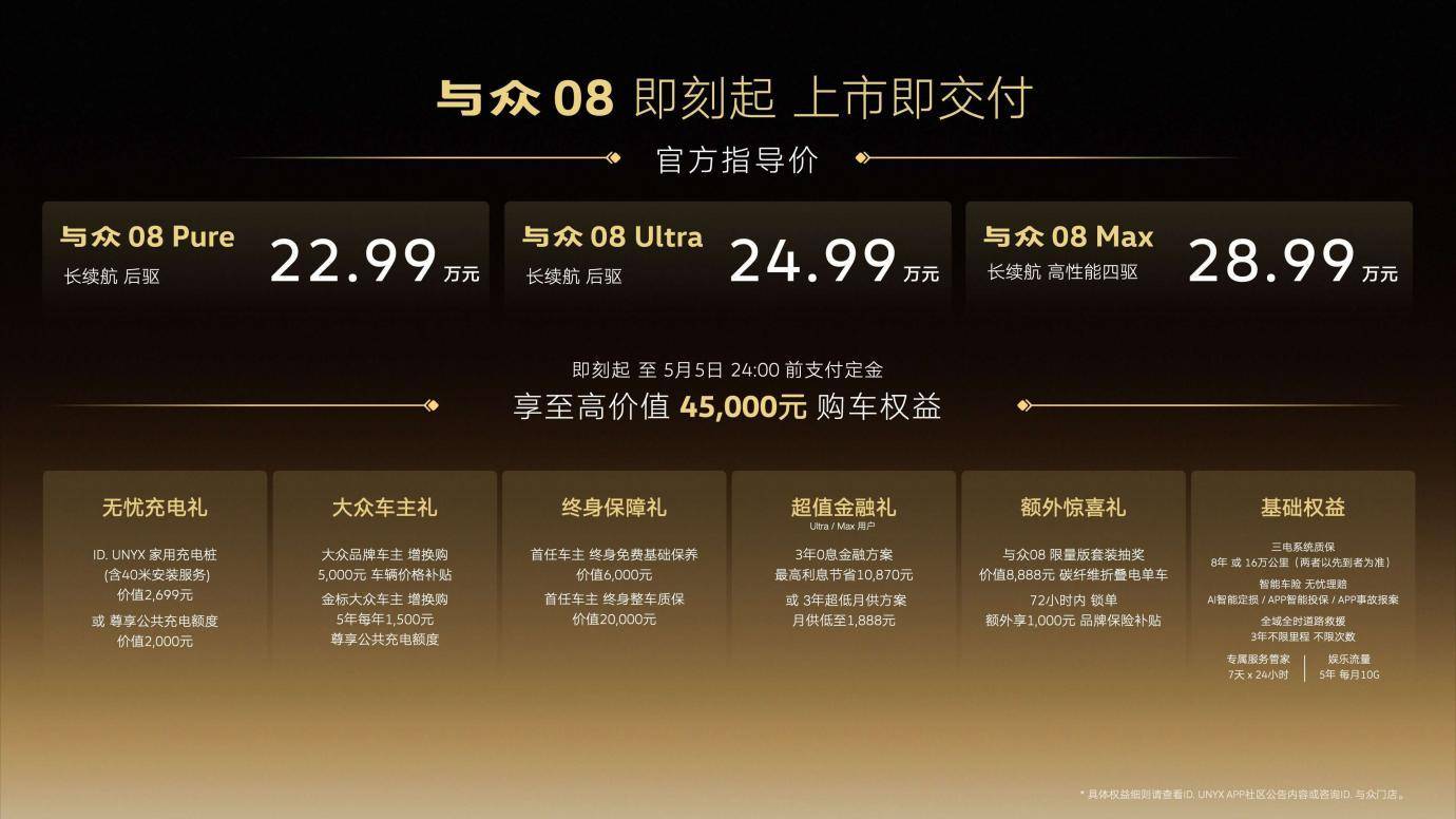 历经24个月的潜心开发,金标大众旗下首款全时互联全尺寸纯电SUV——与众08正式上市,新车推出了Pure、Ultra、Max共3个版本,官方指导价为22.99万元-28.99万元。新车推出了丰富的限时权益,即刻起至5月5日24:00前支付定金,即可享至高价值45,000元购车权益。
