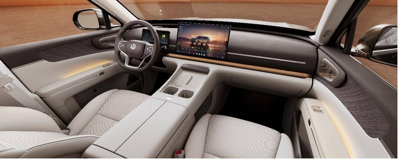 D19车身侧面采用天空之境纯平侧窗,零阶差设计媲美百万豪车工艺,兼顾颜值与驾乘静音性;银辉之冠拼色车顶弱化厚重感,搭配21英寸向往之境轮毂与米其林轮胎,高级感十足。新车推出松谷绿、光电白、液态银、天幕灰、金属黑共五款自然共生车色,其中松谷绿采用巴斯夫豪华品牌同源漆料,远观如松、近看含光,尽显自然高级质感。