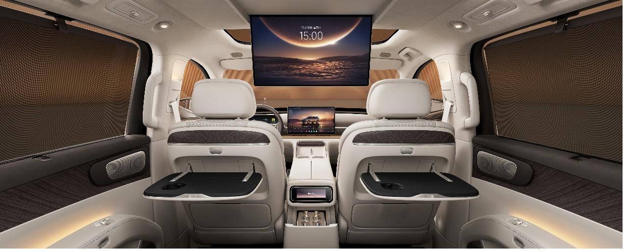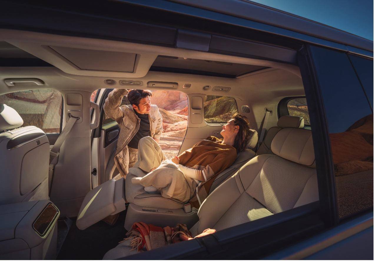 座椅采用12层奢享级结构,全车座椅支持电动调节,并实现6座加热、4座吸入式通风与10点式按摩,二排右侧零重力座椅支持120°零压躺姿、4向腿托与ABTS一体式安全带,1.9米乘员也能享受悬浮式休憩体验。第三排为同级超大贵宾座,支持131°靠背无极调节、座椅加热与一键电动翻折,搭配专属双扶手与全平地台,彻底解决传统三排“小板凳”痛点。此外,二/三排专属遮阳帘遮蔽率分别达93.2%、91%,全方位兼顾舒适与隐私。