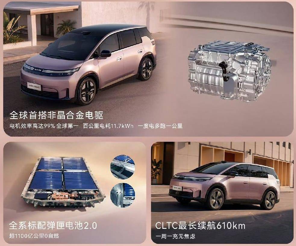 动力系统搭载广汽自研非晶合金碳化硅电驱,电机效率高达99%,最大功率分别为100千瓦和165千瓦,匹配三种容量的磷酸铁锂电池,最高续航里程为610公里。