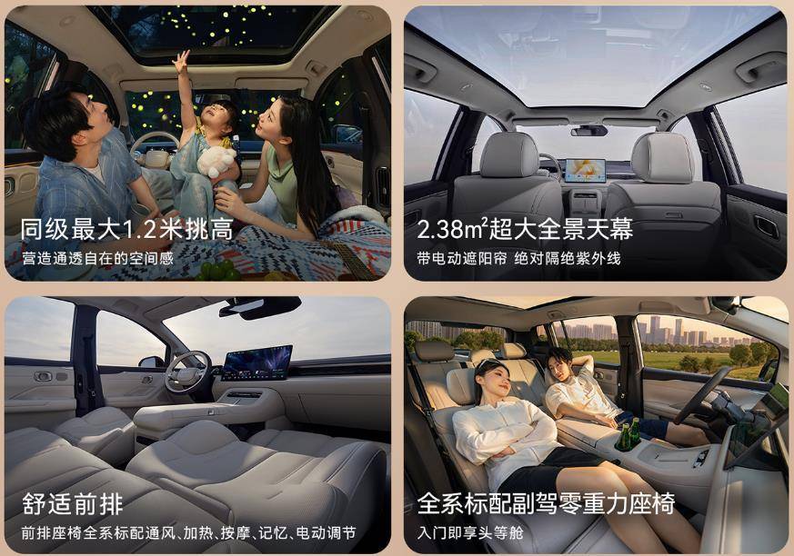 舒适性配置层面,新车全系标配副驾零重力座椅,配备8点式SPA按摩、吸风式通风/加热及记忆功能,车顶还配备了一块2.38㎡的全景天幕并带有电动遮阳帘。储物空间方面,全车设计35处收纳位,后备厢常规容积447L,放倒后排座椅可扩展至1947L。