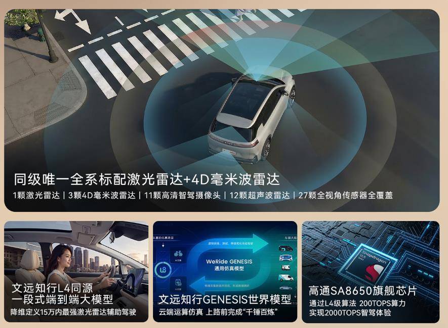 智能辅助驾驶也没有缺席,AION N60全系标配4D毫米波雷达+192线激光雷达,采用文远知行端到端大模型,支持NDA城区/高速领航辅助、全场景智能泊车等功能,可实现跨楼层记忆泊车(部分功能需OTA升级)。