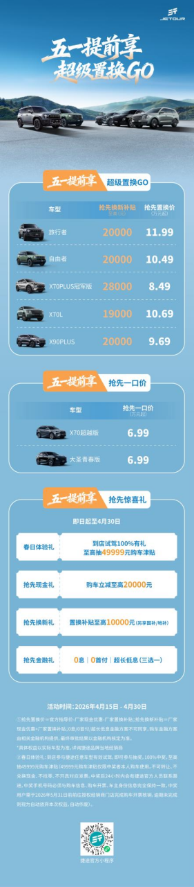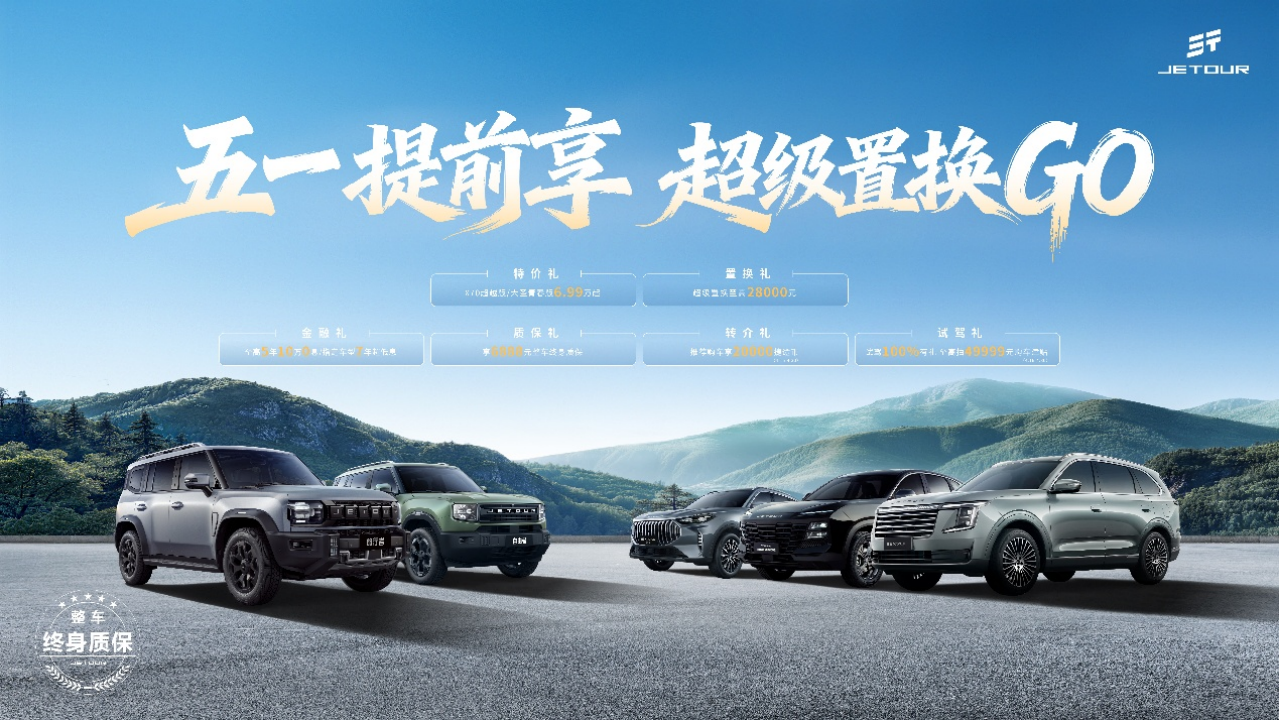 五一提前享,超级置换GO!为迎接五一黄金假期、满足用户自驾出行焕新需求,捷途汽车带来“五一提前享 超级置换GO”活动,即日起至4月30日抢先畅享五一超值政策,不用苦等小长假即可锁定抄底价,活动期间可享抢先置换价,更有至高49999元试驾购车津贴派送,叠加购车直降至高20000元、置换补贴至高10000元、0息/0首付/超长低息金融方案、整车终身质保及推荐购车好礼,多重福利一步到位,助力更多用户轻松焕新座驾,自在奔赴每一段旅程。