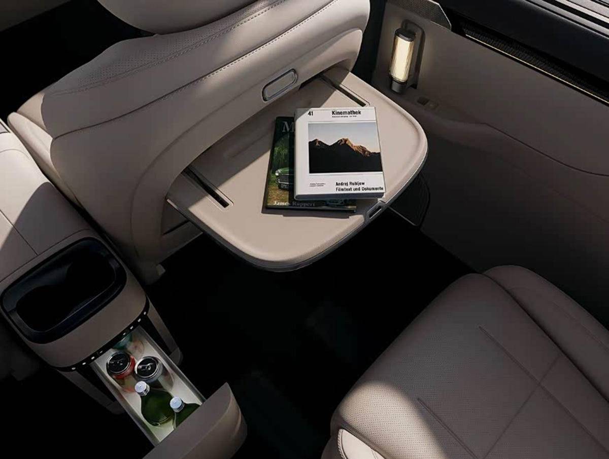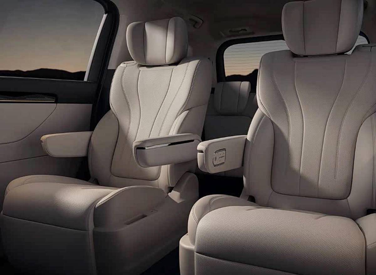 车内座椅采用的是2+2+3布局,后排车顶带有吸顶电视大屏,前排座椅靠背还带有后排小桌板,前排扶手箱后部带有冰箱,第二排使用了大沙发式的座椅。