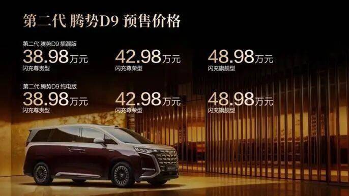 本次下线的第二代腾势D9,正是比亚迪核心技术的集大成之作,新车预售价为38.98万-48.98万。作为全球首款搭载第二代刀片电池的量产MPV,该车搭载比亚迪第二代刀片电池,续航实力全面突破:插混车型纯电续航达 401km,纯电车型续航高达 800km;并带来“5分钟充好,9分钟充饱,零下30℃充电仅多3分钟”的颠覆性充电体验。第二代腾势D9的长续航+闪充黄金组合,实现充电自由 + 时间自由 + 出行自由,让用户真正零焦虑。在智能化领域,新车全系标配天神之眼5.0智能驾驶系统,采用行业领先的全闭环端到端架构,具备自主强化学习能力,可依托海量真实驾驶数据持续迭代进化,实现更平稳的驾驶、更精准的泊车、更迅捷的反应,为用户全程保驾护航。在设计方面,新车内饰采用全新的设计语言,中排升级零压云绒座椅,以百万级的豪华标准,将豪华体验提升至全新维度。