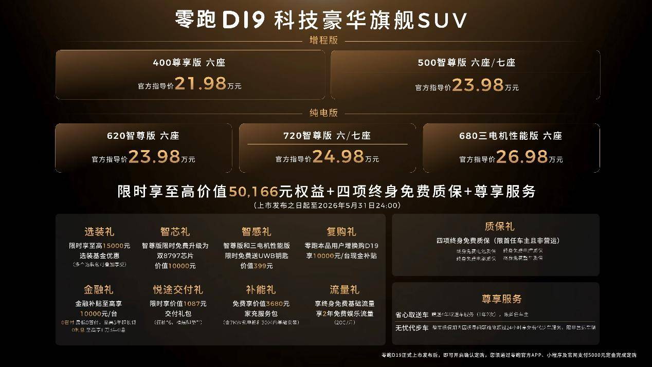 就在4月16日,零跑汽车D系列首款车型—零跑D19正式上市,官方指导价21.98-26.98万元,凭借“百万级产品力、二十万级定价”的颠覆性表现,精准击中消费者痛点,彻底打破“旗舰必高价”的行业惯例,成为30万内科技豪华旗舰SUV的最优解。