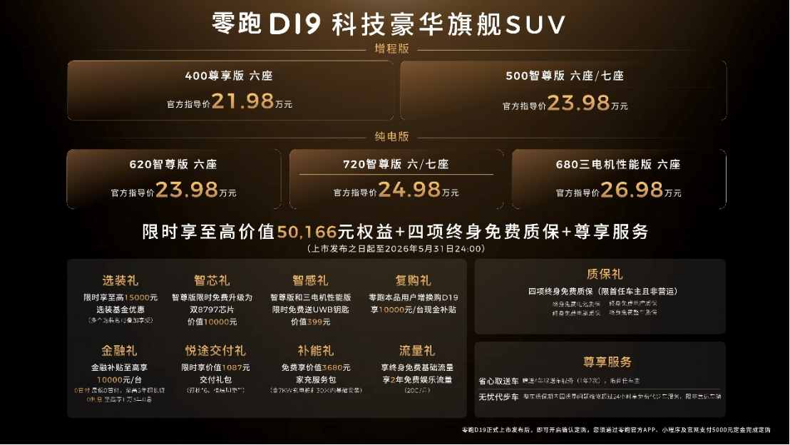 这份硬核实力的背后,是零跑全域自研的底气——核心零部件自研自造占比超65%,2025年销量登顶新势力榜首并实现年度盈利,为D19诞生筑牢根基。上市限时权益同样丰厚,至5月31日下定,可享多重豪礼,权益价值最高达50166元,诚意拉满。