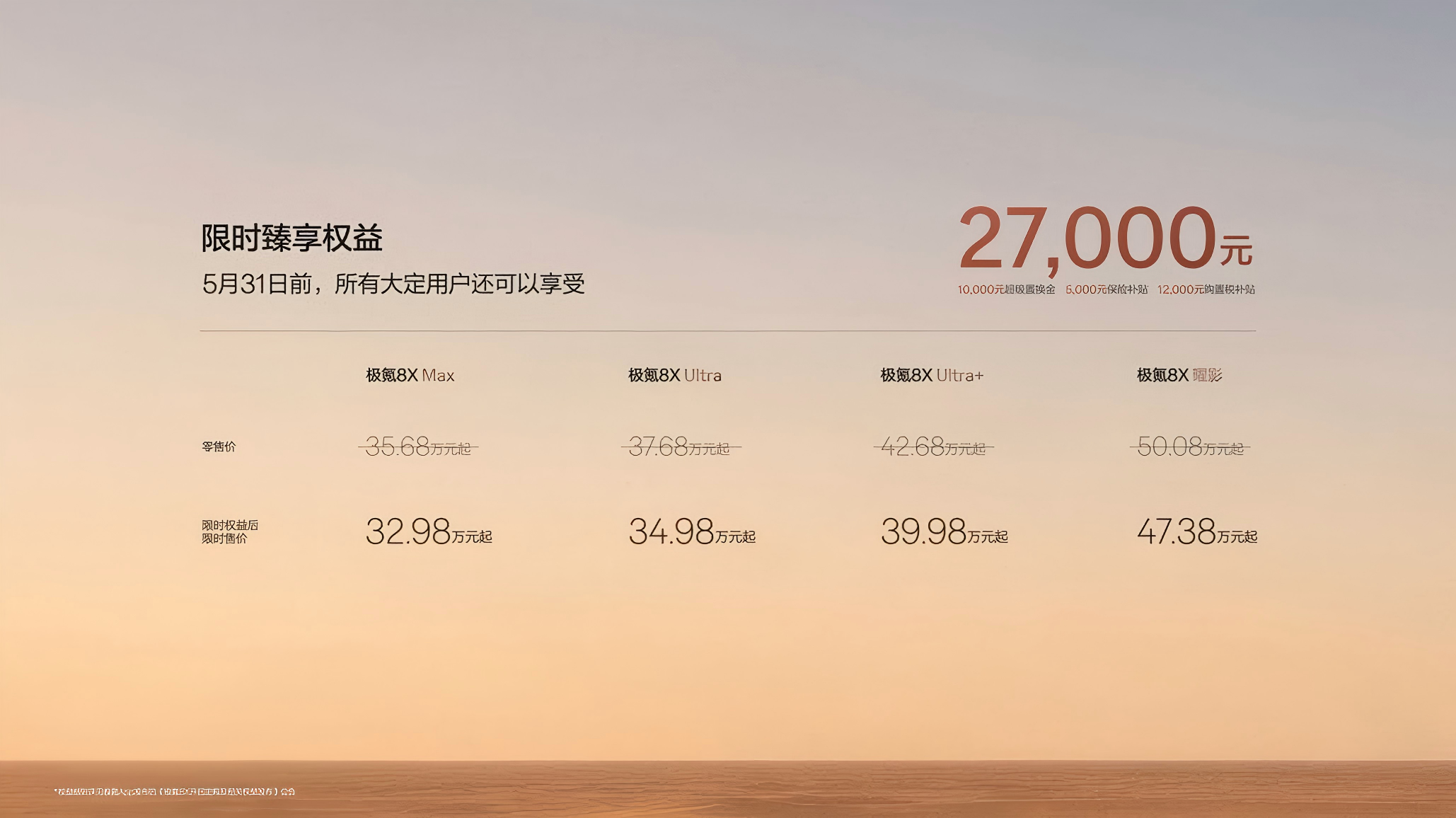 4月17日,极氪品牌成立五周年之际,旗下全新高性能旗舰SUV——极氪8X正式全球上市。新车共推出Max版、Ultra版、Ultra+版三大核心版型,官方零售价35.68万-42.68万元,限时权益后售价低至32.98万-39.98万元;性能天花板曜影版同步上市,官方零售价50.08万元,权益后限时售价47.38万元。
