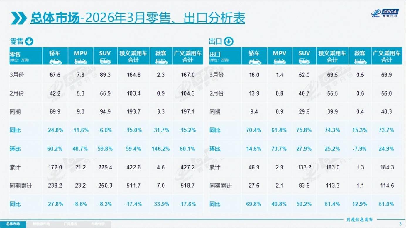 尤其是2026年开年的车市,更是充满寒气,根据乘联会发布的数据,2026年1-3月,狭义乘用车累计销量达422.6万辆,同比下滑17.4%,1月销量同比下滑13.9%,2月销量同比下滑25.4%,3月销量同比下滑15%。