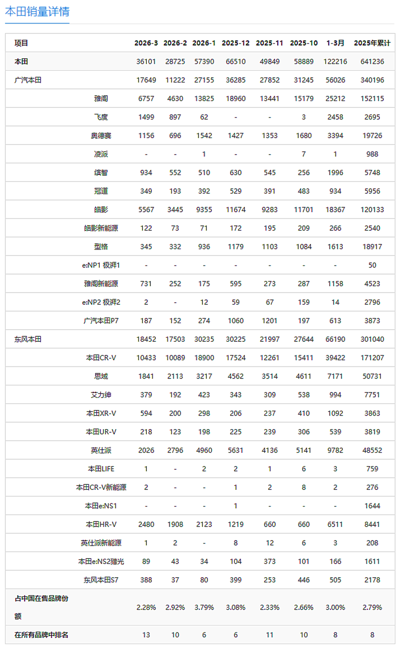本田汽车在2020年创下销量最高记录,两大合资公司和进口车共销售162.7万辆;可是后续销量则为持续下滑,在过去的2025年里,其全年终端销量仅为64.53万辆,同比降幅为24.3%。客观上确实存在燃油车产能利用率显著偏低的情况。本田汽车2026年第一季度零售销量显示为122216辆,如果产品线在年内没有优化升级的话,不排除2026年全年销量再次下滑的可能。