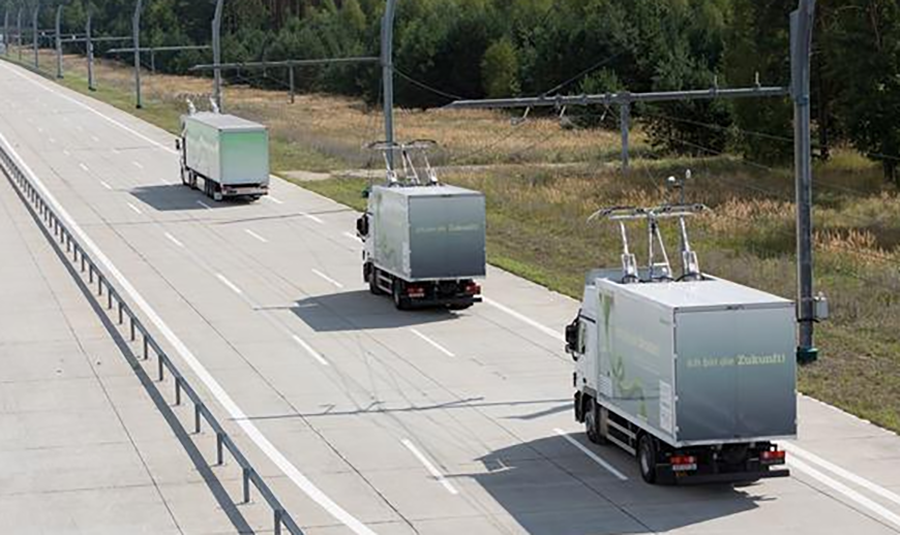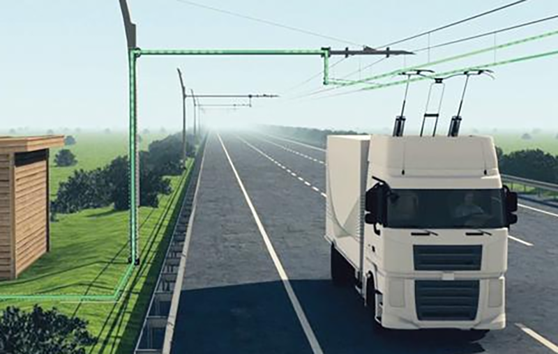 给车辆提供电能的可以是像路灯杆一样的设备,从路侧向道路上方延展,用于架设电缆。随后则只需要车辆统一“受电标准”即可,简单来说就是用无轨电车的模式;现在道路上方建造架空接触网,电动汽车行驶到专用道路之后升起车顶的受电弓,当受电弓搭上接触网的时候,接触网即可通过受电弓输出高电流。