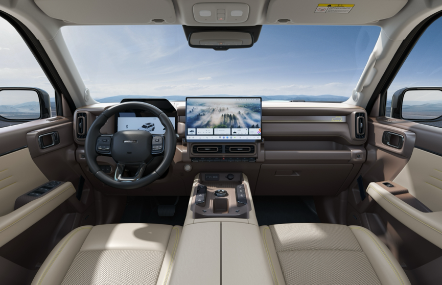 猛龙PLUS延续经典方盒子设计,车身尺寸491219501905mm,轴距2850mm。方正轮廓搭配硬朗进气格栅与环形大灯,既有传统硬派SUV的基因,又融入新能源时代的精致感。高坐姿带来开阔视野,大通透观景窗将户外景致自然延入座舱,每一次出行都像移动的观景台。
