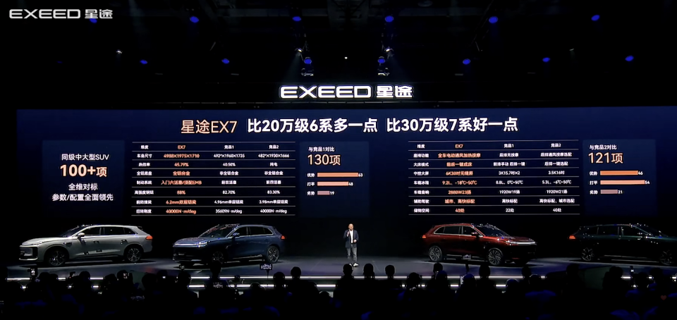 星途EX7是星途品牌3.0战略锚定全球性能豪华创新者定位后的首款量产车型,依托真C级532黄金车身尺寸,长4988mm、宽1975mm、高1710mm,轴距3000mm,打造3.45立方米超大座舱空间、78% 同级领先得房率,兼顾激情驾控与全家奢享,彻底打破悦己与悦家的对立矛盾。新车提供铂金纯电加黄金增程双动力布局,全系标配800V高压平台、飞鱼底盘3.0、雪豹四驱2.0,全球首搭航空级EMB线控制动,全系标配猎鹰700一段式端到端智能辅助驾驶,以130项全维领先配置,重新定义20-30万级家用豪华 SUV 价值上限。