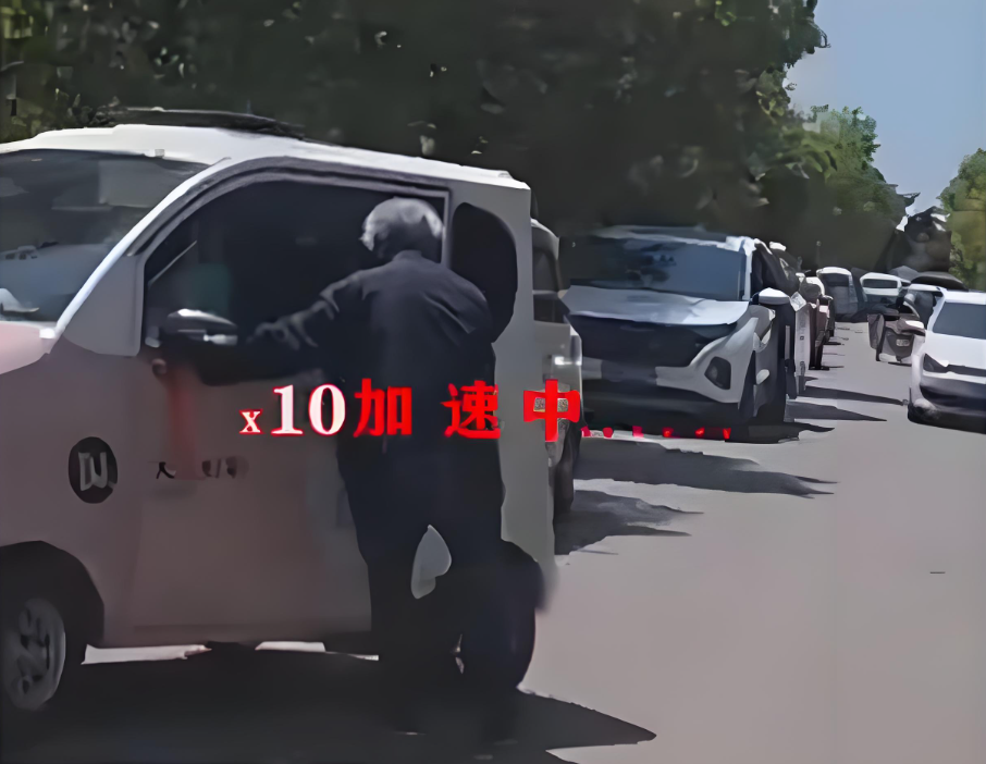 视频中的老人在公路上驾驶“老头乐”掉头,掉头的过程中操作就从来没有对过;向前的时候直接撞树,在一个骑摩托车的小伙子上前指挥后依然操作错误,结果倒车的时候又撞到了后方的树,之后还差点撞上小伙子的摩托车。停车之后还没有拉手刹,差点撞到了后方的汽车。