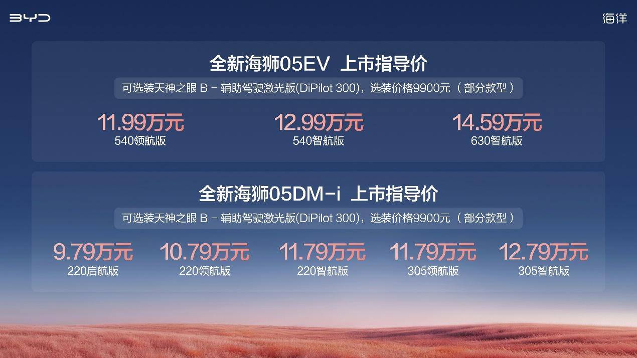 日前,比亚迪海洋网全新海狮05正式上市,新车推出EV纯电与DM-i插混双动力版本。其中,全新海狮05EV官方指导价11.99万-14.59万元,提供540km和630km两种CLTC纯电续航版本;全新海狮05DM-i官方指导价9.79万-12.79万元,提供220km和305km两种纯电续航。凭借双动力协同布局和超100项全系标配,全新海狮05在驾控、智能、续航、舒适、安全五大维度上实现了全面进阶。