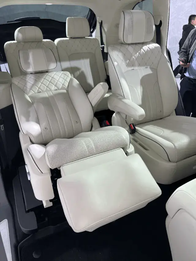 第二排冰箱彩电大沙发是基础配置,3米15的轴距,给了二三排充足的距离和空间,去营造座椅的舒适度,每张座椅的填充都很充实,夸张的是全车6张座椅都有按摩,都有头枕音响,算上这6个音响,车内一共配备32个,以前是座椅舒适平权,现在V9X又把配置平权了。