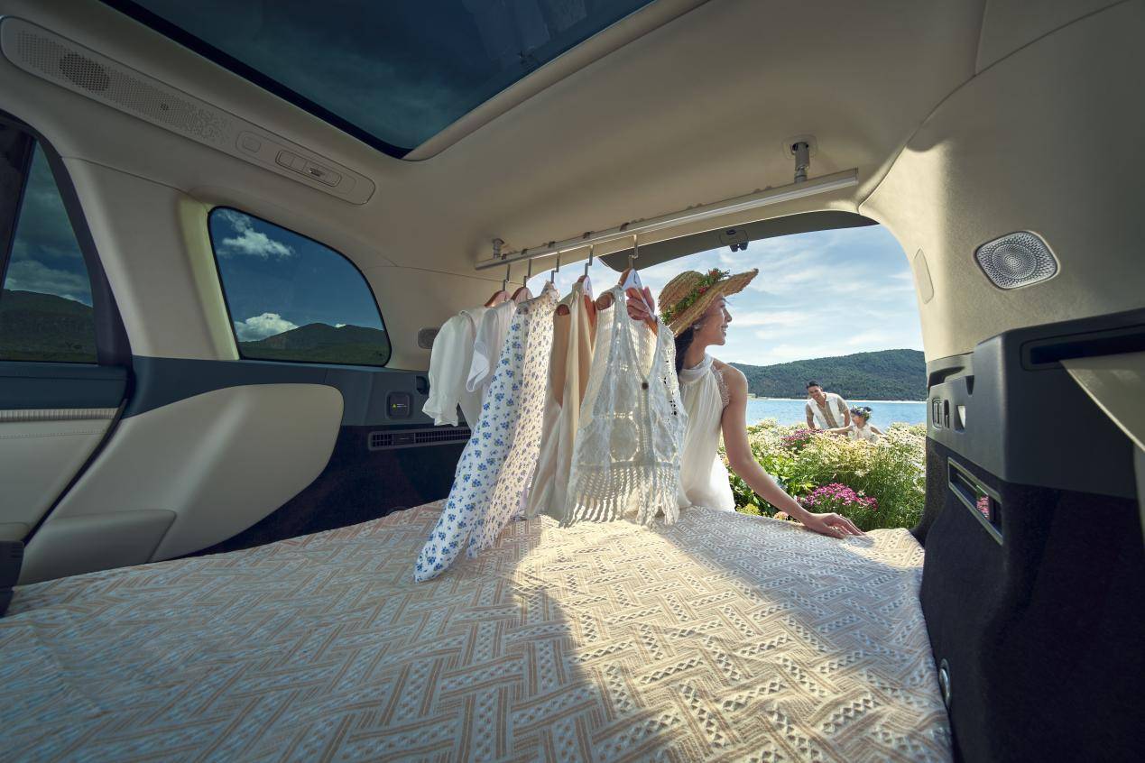 座椅这块必须多唠叨两句,三种模式切换——三座、四座、五座,二排是双享零重力,还带揉捏式按摩,32个按摩点、12个球头,累了按一会儿是真舒服。最实用的是一键成床,1分钟就能铺好2.1米纯平大床,午休、露营躺平都合适,搭配全景天窗,星空下睡觉也挺有感觉