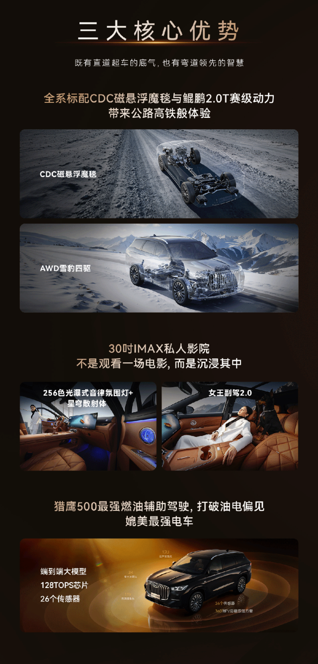 底盘方面采用CDC磁悬浮魔毯,官方比喻其平稳舒适“媲美公路高铁”。搭载的AWD雪豹四驱系统响应时间100毫秒,性能对标Quattro,但价格门槛更低。AI智能飞鱼底盘则集成了双液压悬置、CDC磁悬浮魔毯和AI预判功能,进一步强化舒适性。