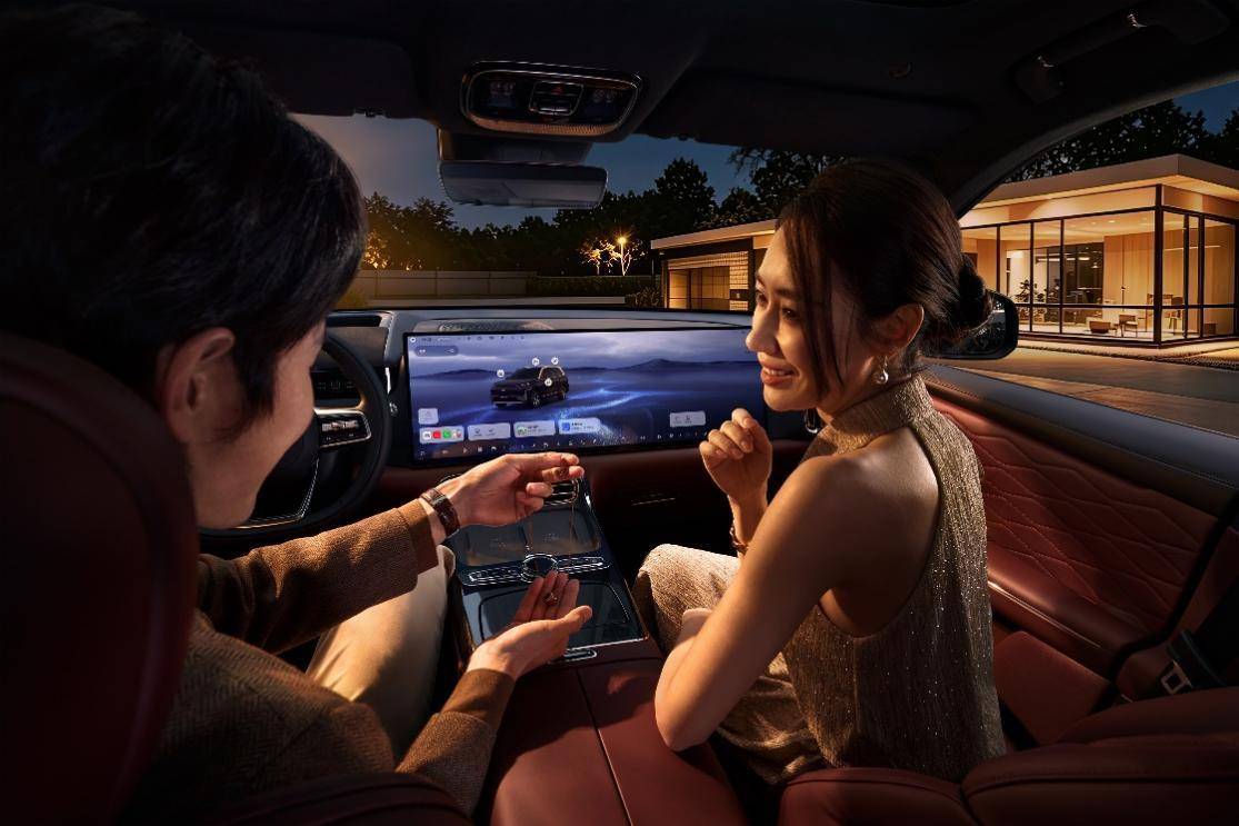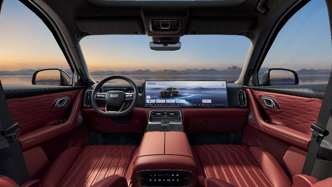 内饰的升级同样走「质感路线」,专属星云红配色源自玫瑰星云,但饱和度控制得很好,不艳俗、不浮夸,透着细腻的豪华感,门板上的「星河浅浪」饰纹,细节处理到位,没有廉价感。用料方面,厂家确实没敷衍:座椅采用牛脊背头层牛皮,触感细腻,搭配专属菱形绗缝,包裹感不错,官方称经过25000次耐磨测试,日常使用不用担心磨损,耐用性有保障;全车配备麂皮手感的顶棚,亲肤软糯,再加上钻石切割的水晶按键,每一次按压都有不错的仪式感,能看出这次的黑金智曜版就是把家用车的基因里嵌入了点儿「尊」的元素。