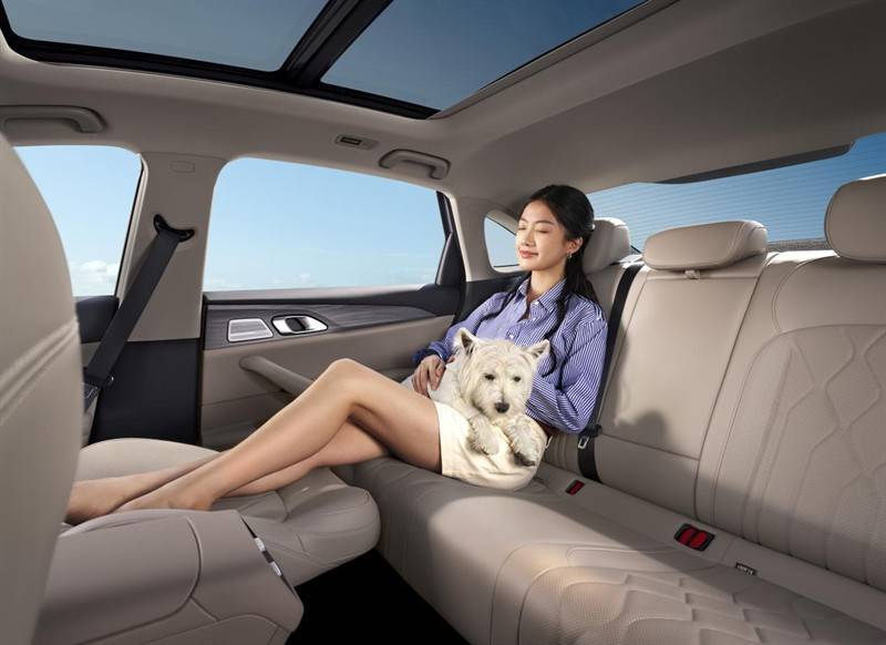 空间方面更是越级表现,两车轴距都是2845mm,车长 4935mm,车内得房率 84.87%,后排腿部空间 950mm,纯平地板坐三个人也不挤。棉花糖座椅带三档通风加热,全车 28 处储物空间,后备箱 547L,婴儿车、行李箱随便放,全家出行妥妥的舒适。