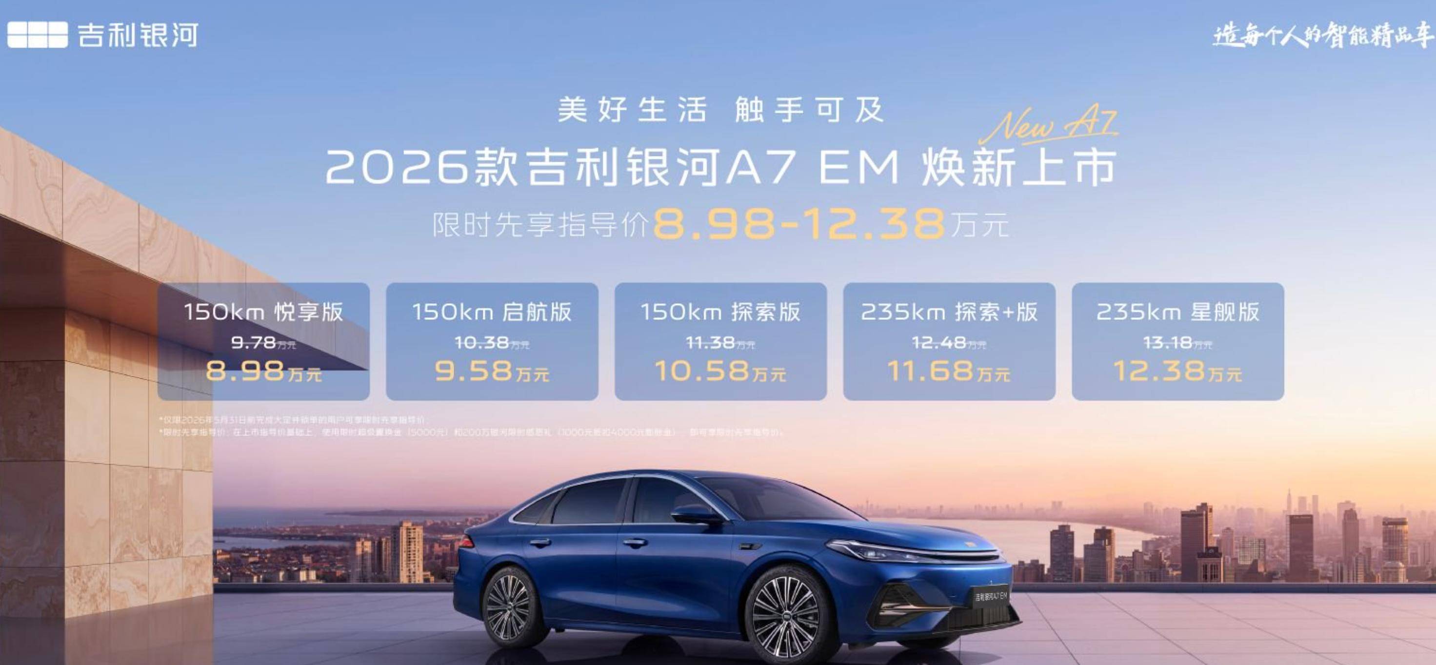 先看最关心的价格,2026 款银河 A7 EM 限时先享价8.98 万起,纯电版 A7 EV10.28 万起,这个价位能买到中级家轿,还是新能源,放在以前想都不敢想。而且 5 月 31 日前下定,福利直接拉满,EM 版有 5000 元置换金 + 1000 抵 4000 膨胀金,EV 版更是 6000 元置换金 + 1000 抵 5000 膨胀金,叠加多重权益,至高能省近 4 万,买车压力直接减半。