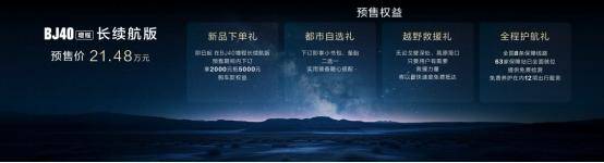 预售阶段,新车推出四重专属权益:2000 元抵扣 5000 元车款、备胎与户外装备二选一、全域免费越野救援、全国 63 家保障站 12 项免费养护服务,全方位覆盖用户用车全周期需求。