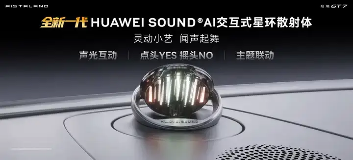 同时,启境GT7首创全新一代HUAWEI SOUND AI交互式星环散射体。位于中控台顶部中央的灵动智慧伙伴,接到指令会主动转向你、认真聆听,还会点头、摇头,灵动可爱。跑山、智驾等模式还有专属声光联动,让人车交互更具温度与仪式感。