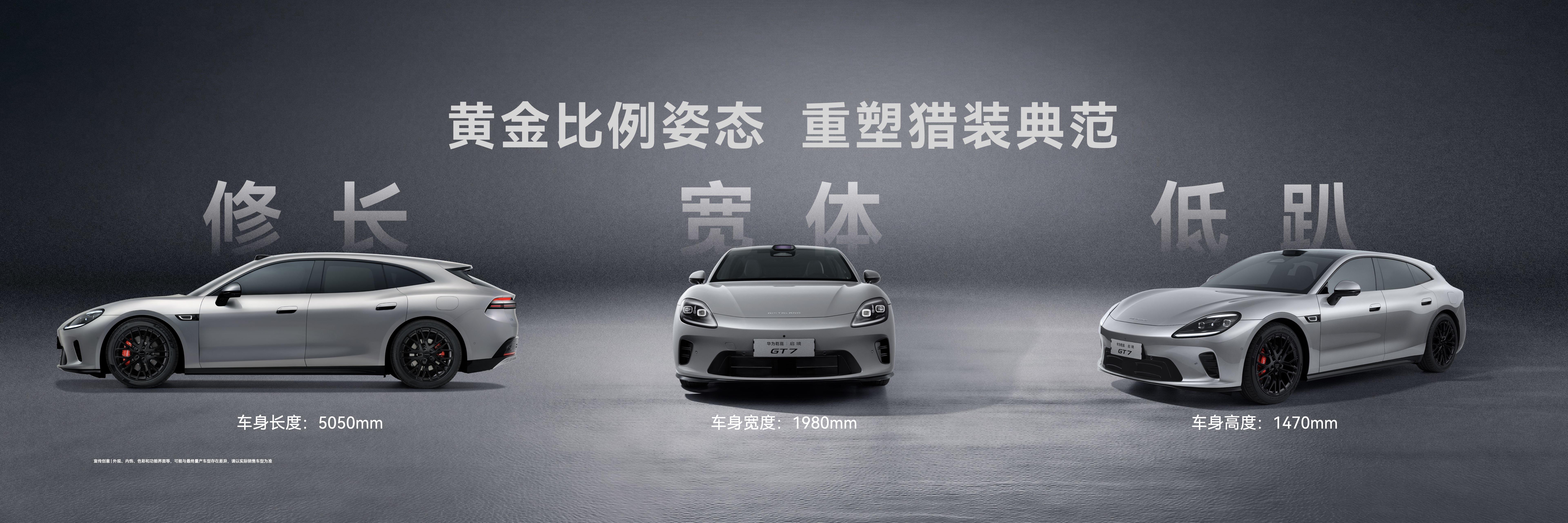 启境GT7车身尺寸为5050/1980/1470mm,轴距3000mm,轴长比59.4%。猎装角21.5度,兼顾造型与后备箱空间。后轮配备275mm宽胎,轮高比51.2%。“启境之翼”尾灯由526颗独立光源组成,并采用行业首个分段式漫反射尾灯。全球首创华为乾崑智驾ADS瀑布式蓝灯。