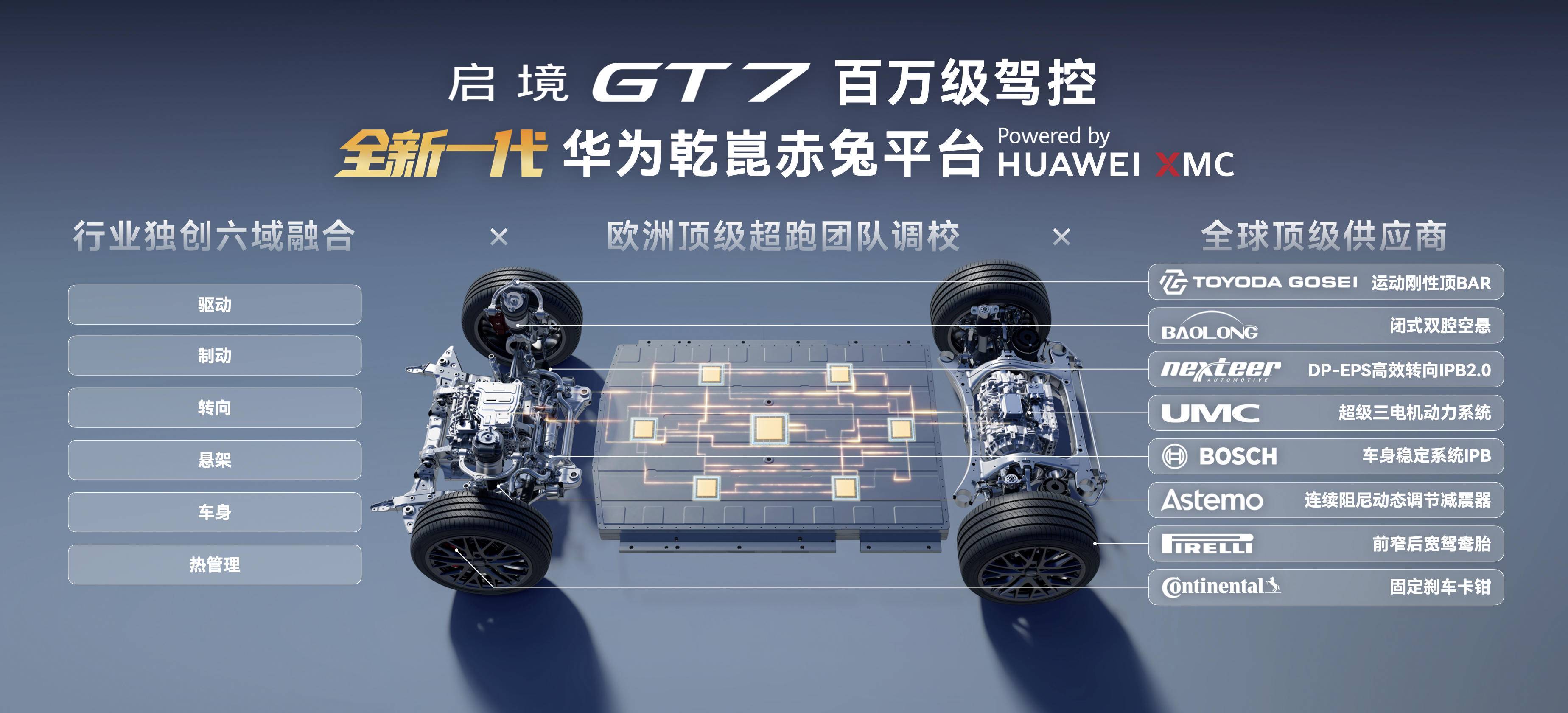 启境GT7搭载新一代华为乾崑赤兔平台,底盘硬件采用前双叉臂+后H臂多连杆悬架,杆系全铝材质,簧下质量减轻20%。全系标配闭式双腔空气悬架+连续阻尼可调减震器,俯仰抑制和抗侧倾性能提升20%,悬架刚度调节范围提升36%。制动方面,德国大陆四活塞固定卡钳+倍耐力P ZERO轮胎,百公里制动距离在33米以内。超级三电机加持,零百加速2.98秒,进入2秒俱乐部。