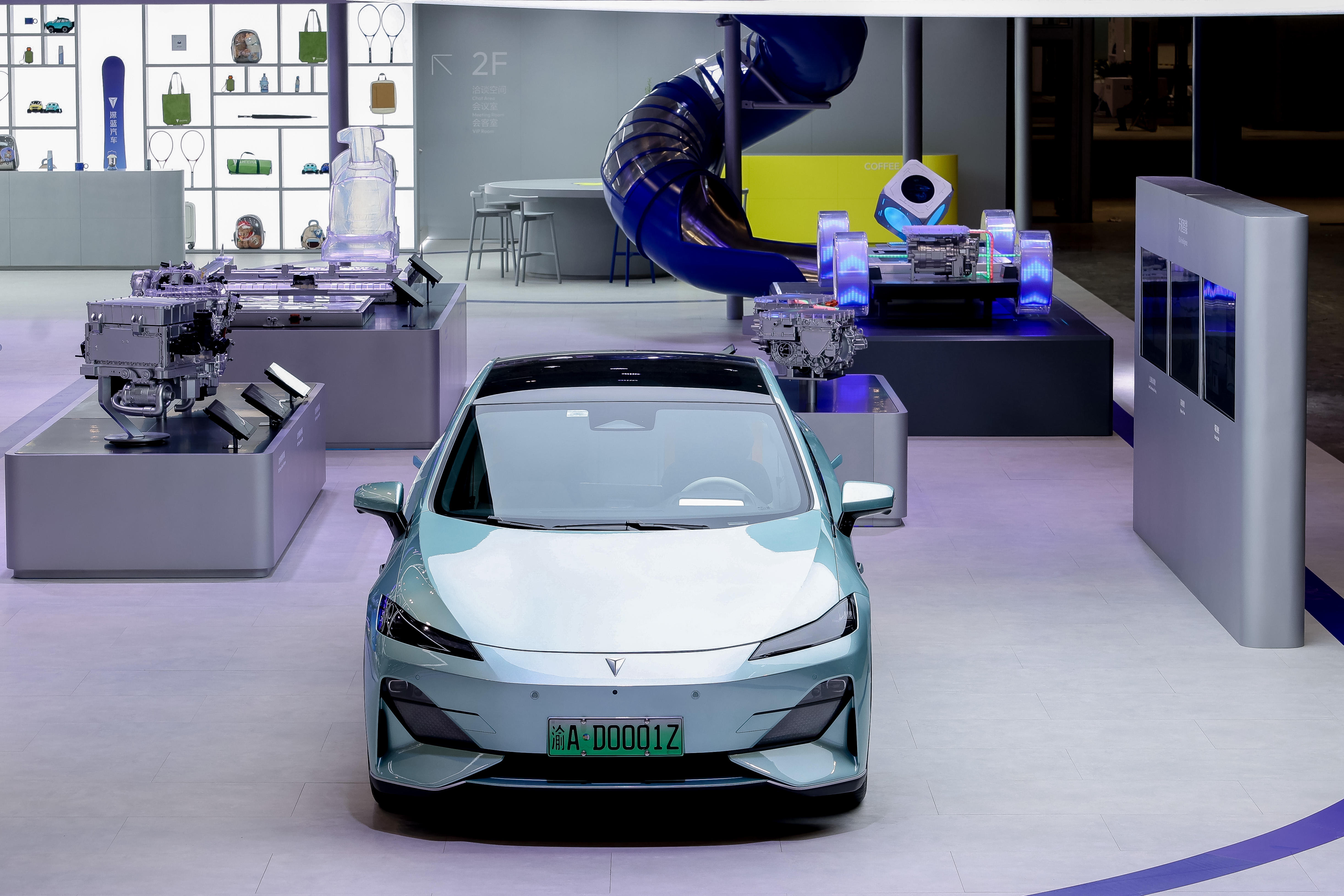 当科技性能与运动美学在驾驶中碰撞,深蓝汽车不仅是车,更是年轻态人群彰显个性、释放态度的潮流秀场。深蓝汽车展台整体采用极简未来主义风格,并第一次在展台设计上将品牌视觉调性的VI色进行应用与强化表达,通过“无界蓝”“量子蓝”“探索黄”等色彩碰撞与搭配,凸显品牌年轻科技运动的调性;裸眼3D大屏,呈现深蓝汽车LOGO及车型,品牌科技感调性拉满。同时精心设置L06驾趣体验、螺旋滑梯、车衣换色展示、拳击沙袋等年轻化互动装置,打破传统车展的单调模式,打造“可玩的深蓝社区”,让观众从“看车展”真正变成“玩车展”。