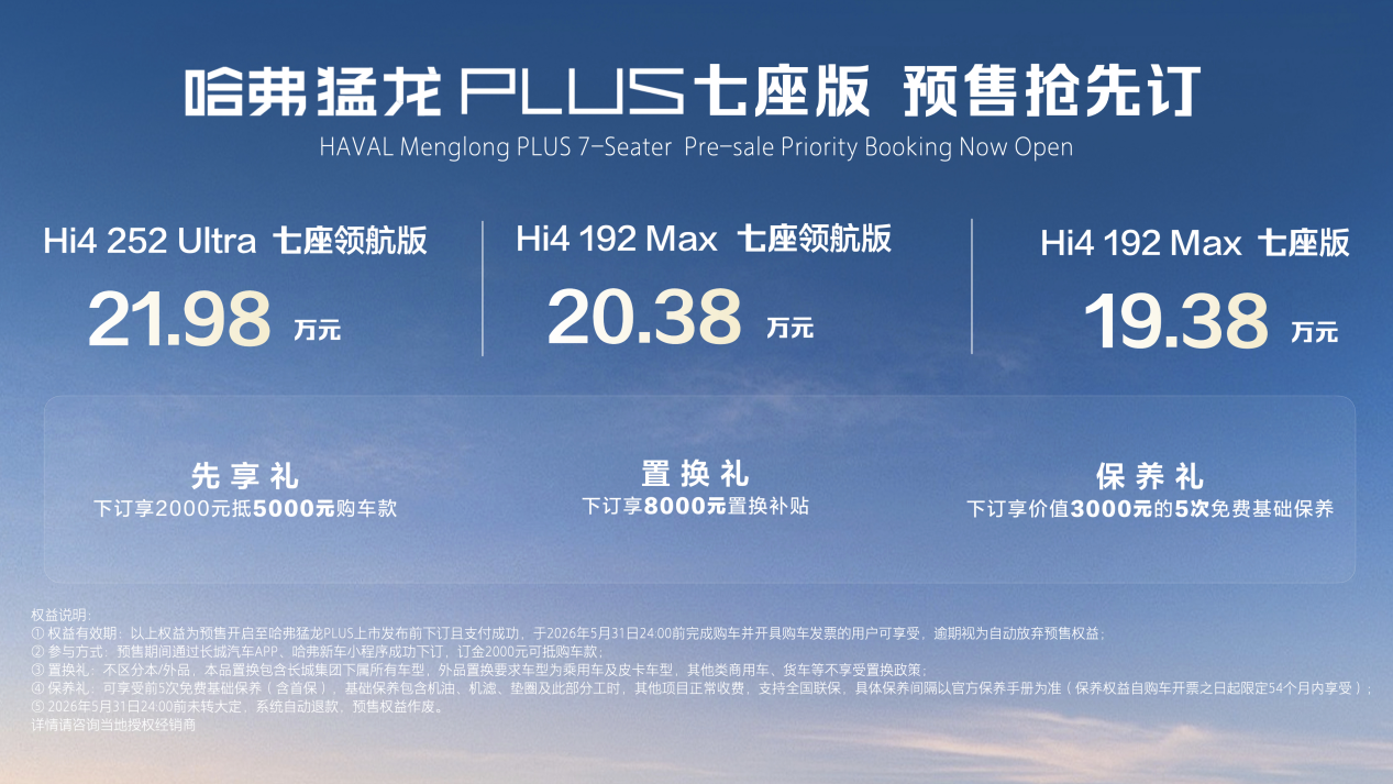 在2026年北京国际汽车展览会上,哈弗品牌以“热爱自由 活出棱角”为主题,携猛龙家族全系阵容重磅亮相。其中,备受期待的哈弗猛龙PLUS七座版正式开启预售,官方预售价格区间为19.38万元至21.98万元,并同步推出多项限时购车权益。新车的推出,不仅标志着哈弗猛龙系列从“单品爆款”正式进化为“家族矩阵”,更以“20万级最懂中国家庭的四驱方盒子”为核心定位,旨在满足现代家庭用户对个性表达与全场景实用性的双重追求,引领该细分市场迈入为家庭深度定制的2.0时代。