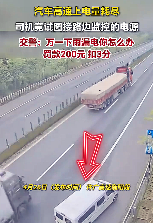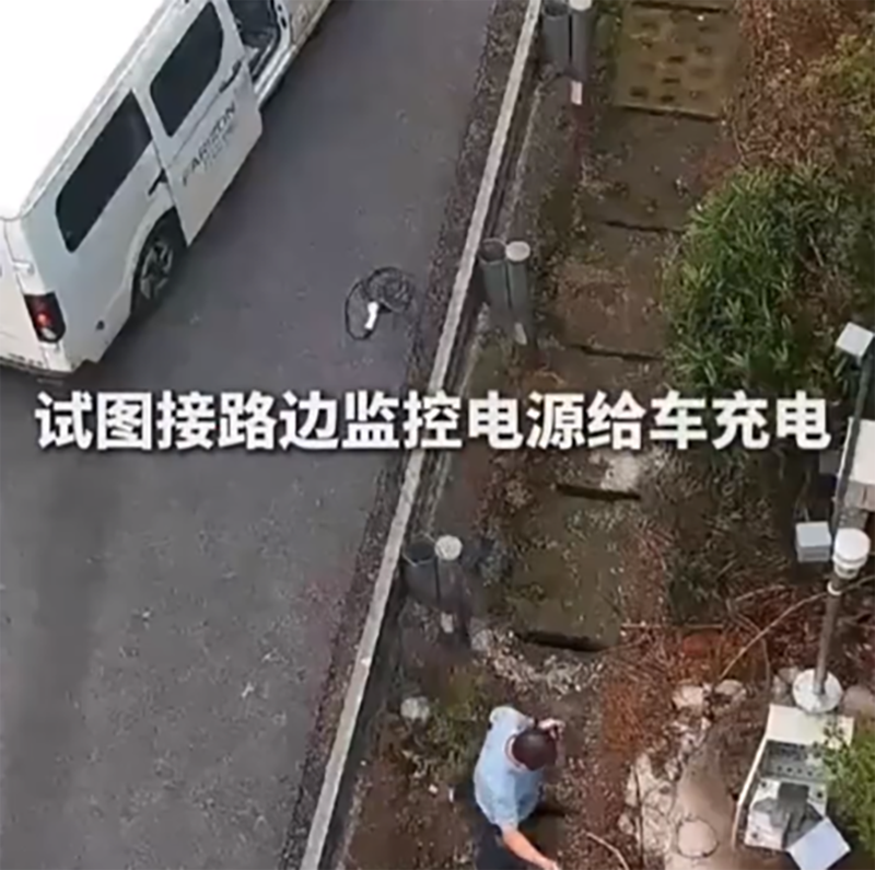 在许广高速衡阳段,一辆白色电动面包车缓缓驶入监控下方的应急车道;车身有一部分跨越在行车道里,停车状态相当危险。导致其车辆停驶的原因是车辆电量耗尽,于是更离谱的事情发生了;司机在路边监控位置找到电源,试图用监控电源给车辆充电。