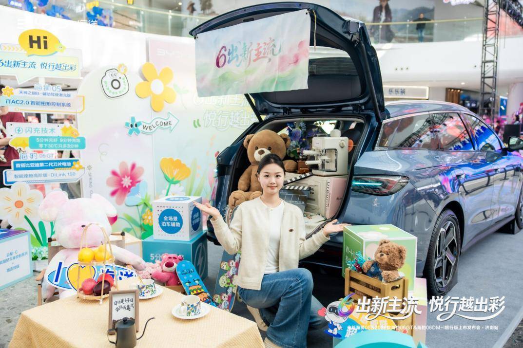 活动当天下午,嘉宾陆续抵达济南融创茂中庭,几款新车静立展台,吸引众多嘉宾驻足观赏。济南融创茂中庭已是人头攒动。比亚迪海洋网的展台凭借四款新车的高颜值外观,瞬间成为商场内的视觉焦点。工作人员穿梭于人流之中,热情地向过往顾客发放定制小礼品。不少家庭被海狮05的外观吸引驻足,年轻人则围着海豹06GT拍照打卡。