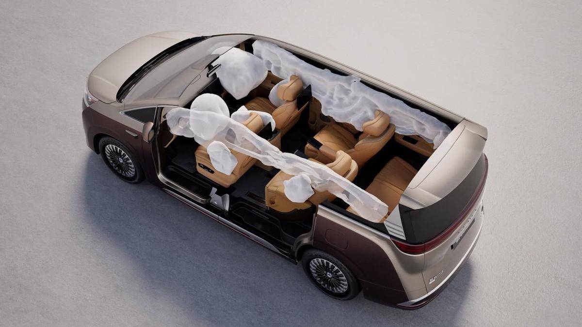 在安全性上,第二代腾势D9下的功夫还不止这些。整车75%采用高强度钢板,其中包含2000兆帕超高强度热成型钢;全系标配9个安全气囊,其中3.2米侧气帘贯穿前中后三排,这些都是安全方面的升级。