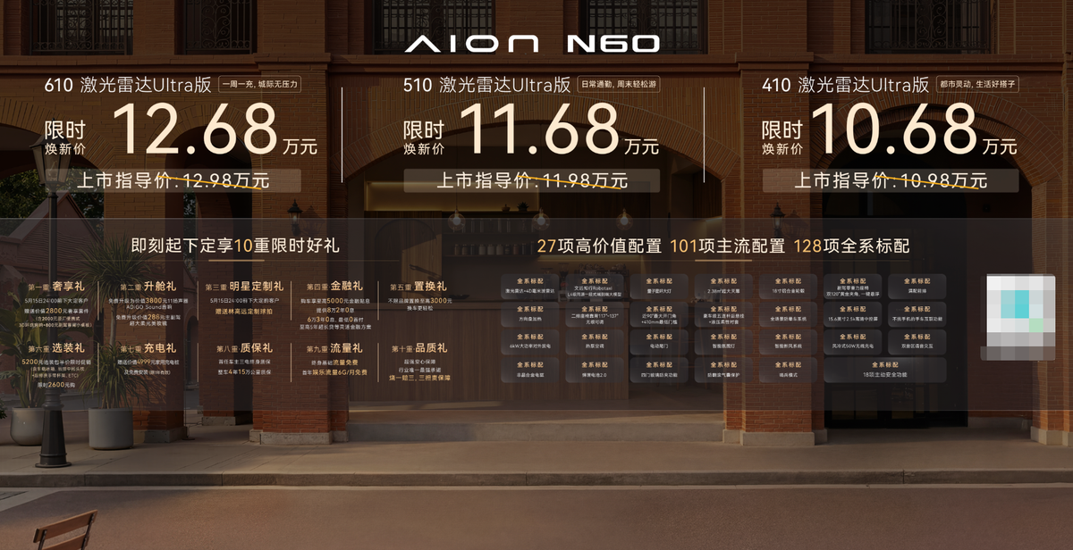 4月28日,埃安N60正式上市了,新车共推出三款车型,售价区间为10,98-12.98万元,限时焕新价10.68-12.68万元。新车最大的看点非常多,比如基于广汽AEP3.0纯电专属平台,以及标配激光雷达、副驾零重力座椅等。那么新车到底如何,我们接着看下去。